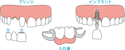 むし歯や歯周病などで歯が抜けてしまうと、食べ物をかめなかったり、話しにくかったりと、生活に支障をきたします。また、見た目が気になるという声も。こうした悩みを解消するため、歯が抜けた所を補うものには、いくつか種類があります。代表的なものとして、まずはブリッジ。これは抜けた歯の両隣の歯を土台にしたかぶせ物です。次にインプラント。これは歯が抜けた部分の骨に支柱を埋め込んで人工の歯を支えます。そして、最も一般的なのが入れ歯です。入れ歯は、残っている歯と抜けた所の歯ぐきで人工の歯を支えます。このうちブリッジは、残っている歯が少ないと使えません。またインプラントは保険適用外で、経済的負担が大きくなります。一方で、入れ歯は残っている歯が少なくなっても使えますし、費用もインプラントほどかからないので、利用しやすいといえます。