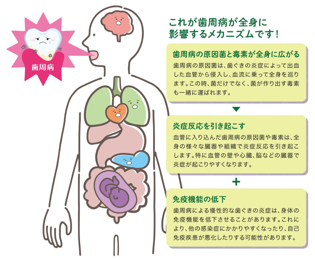近年の研究により、歯周病の原因菌や菌が出す毒素、歯周病による炎症により様々な全身の病気と歯周病が関連することがわかっています。