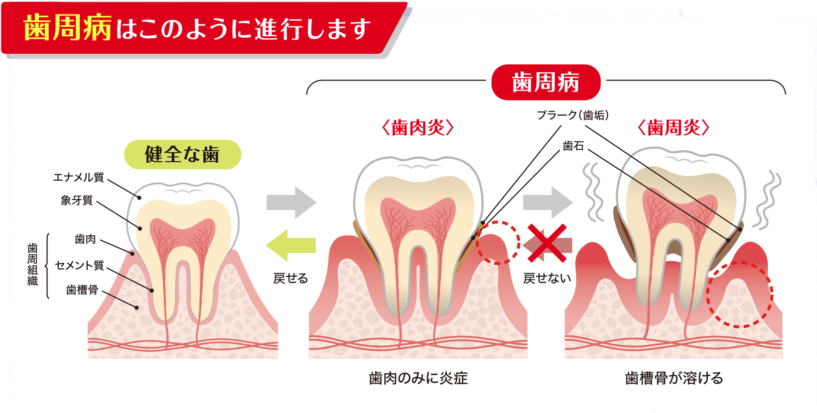 歯周病は、歯と歯ぐきの間にたまった歯垢(プラーク)の中の原因菌が排出する毒素が原因で、歯ぐきに炎症が起こり、進行すると歯を支える骨が溶けてしまう病気です。30歳~40歳頃から始まることが多く、初期段階の「歯肉炎」であれば適切な治療で歯周組織を健全な状態に戻せます。しかし、「歯周炎」の段階に進むと、元に戻すことはできません。歯肉炎から歯周炎への変化を自覚することは難しく、歯がぐらぐらするなど異変に気づいて受診したときにはすでに重症化していて、歯を抜かざるを得ないという事態も起こり得るのです。このことから、気づかないうちに進行する「サイレントディジーズ(静かな病気)」とも呼ばれています。