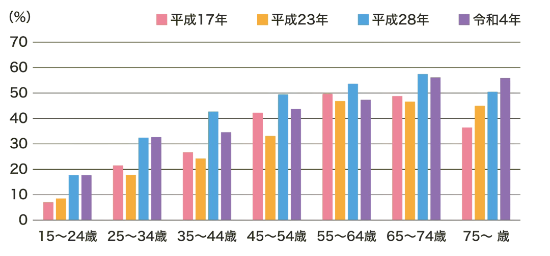 歯周ポケット(4mm以上)を有する人の割合 年齢階級別年次推移